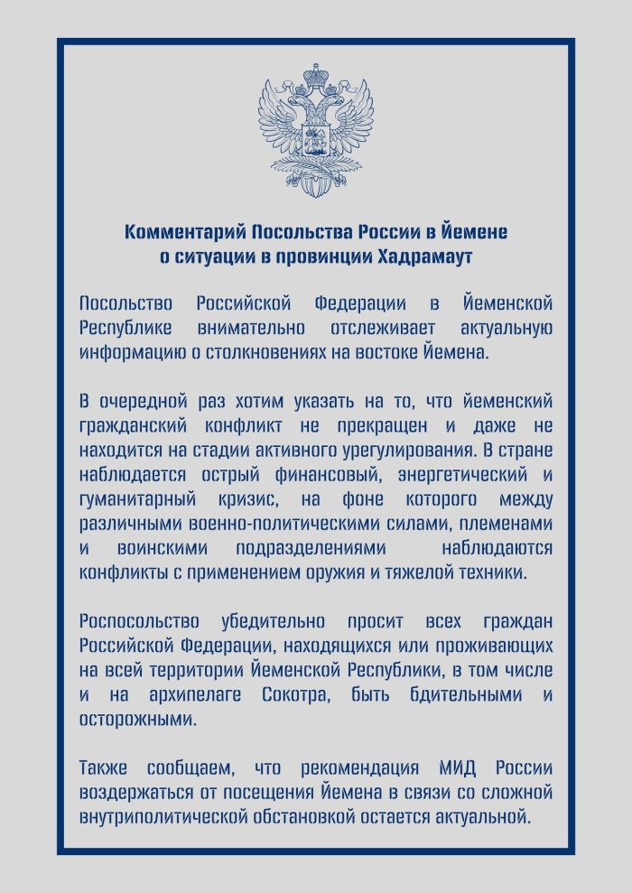 السفارة الروسية باليمن تعبر عن استيائها من تطور الأوضاع السياسية والعسكرية، وتحذر رعاياها من السفر لليمن