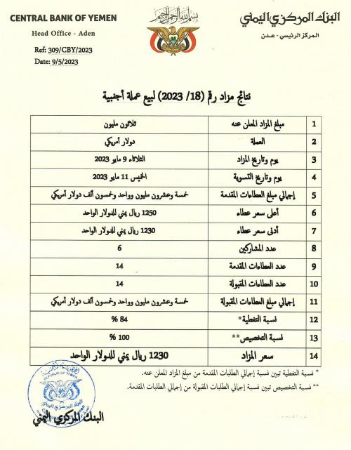 البنك المركزي عدن يرسى سعر المزاد للدولار بـ 1230 ريالاً