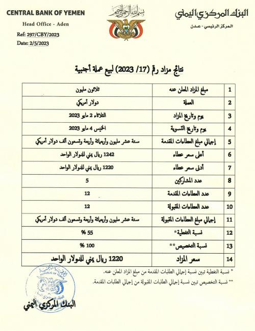 البنك المركزي اليمني يعلن نتائج مزاد جديد بسعر 1220 ريالاً للدولار