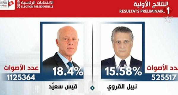 وحصل سعيّد على مليون و125 ألفا و364 صوتا، أي ما يعادل 18,4 بالمئة من الأصوات، فيما حصل القروي على 525 ألفا و517 صوتا، بنسبة 15,58 بالمئة من الأصوات.