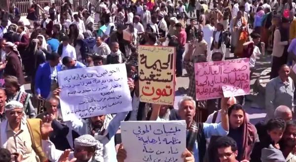 تظاهر المئات في مدينة تعز، الجمعة، تنديدًا بجرائم مليشيات الحوثي بحق سكان منطقة الحيمة بمديرية التعزية شمالي المحافظة.