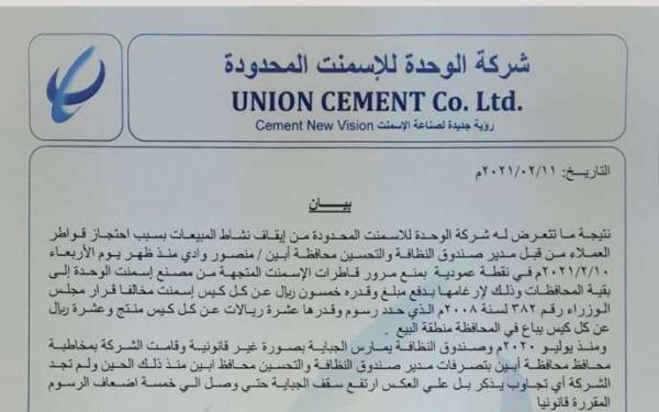 وفي بيان لها اتهمت الشركة صندوق النظافة والحسين بمحافظة أبين باحتجاز قواطر العملاء ومنع عبورها من المصنع إلى بقية المحافظات وإرغامها على دفع خمسين ريال عن كل كيس إسمنت عبوة 50 كيلو جرام.