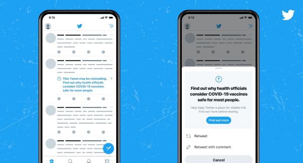 كشفت شركة تويتر بأنها ستبدأ من الآن بوضع إشعارات على التغريدات التي قد تحوي معلومات مضللة حول لقاحات كوفيد_19، وذلك استمرارًا لجهودها في إزالة المعلومات المضللة من المنصة.