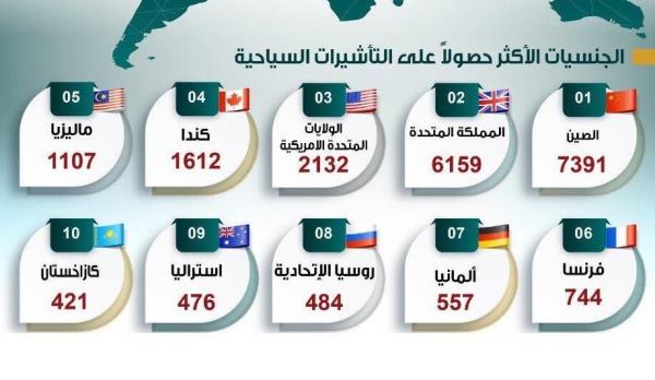 ونشرت الوزارة عدد السائحين من 10 دول جاء في مقدمتها الصين، ثم المملكة المتحدة والولايات المتحدة