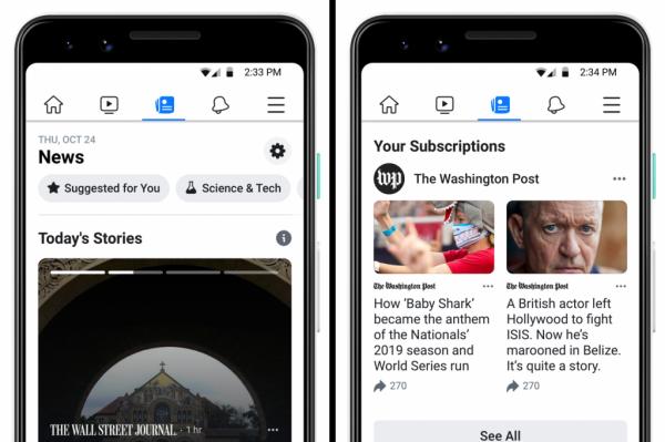 بدأ فيس بوك يظهر أيقونة وقسم خاص عبر تطبيقها الرسمي لبعض المستخدمين تعرض من خلالها الأخبار من أبرز وأهم وسائل الإعلام وبمختلف الاهتمامات.