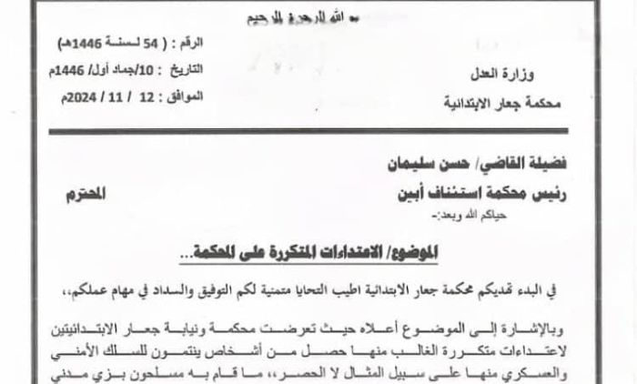 أعلنت محكمة جعار الابتدائية بمديرية خنفر في محافظة أبين ، برئاسة فضيلة القاضي محمد حسين الناخبي ، عن تعليق عملها بسبب الاعتداءات المتكررة على المحكمة.