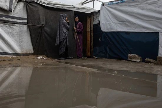 رصدت الصور رجال فلسطينيون نازحون داخليًا يحملون خيمتهم التي غمرتها المياه أثناء هطول أمطار غزيرة في مخيم خان يونس في جنوب قطاع غزة، وغرق الممرات بين الخيام، ومعاناة الأطفال من البرودة الشديدة، كما رصدت الصور مشهد عام من الأعلى للخيام
