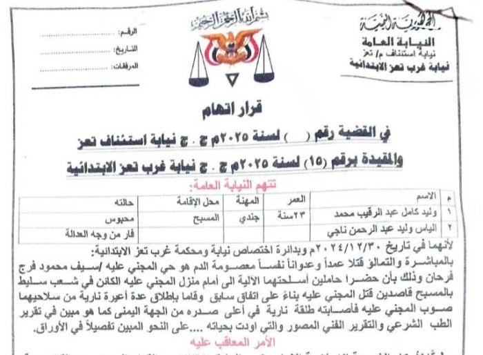 أصدرت نيابة غرب تعز الابتدائية ونيابة استئناف محافظة تعز قرار الاتهام بحق المتهم الأول وليد كامل عبدالرقيب، والمتهم الثاني إلياس وليد عبدالرحمن الفار من وجه العدالة، وذلك في قضية مقتل المواطن سيف الشرعبي والد الطفلة غدير الشرعبي، الذي تم تصفيته على يد المدعو وليد شلعة في أواخر ديسمبر من العام الماضي.