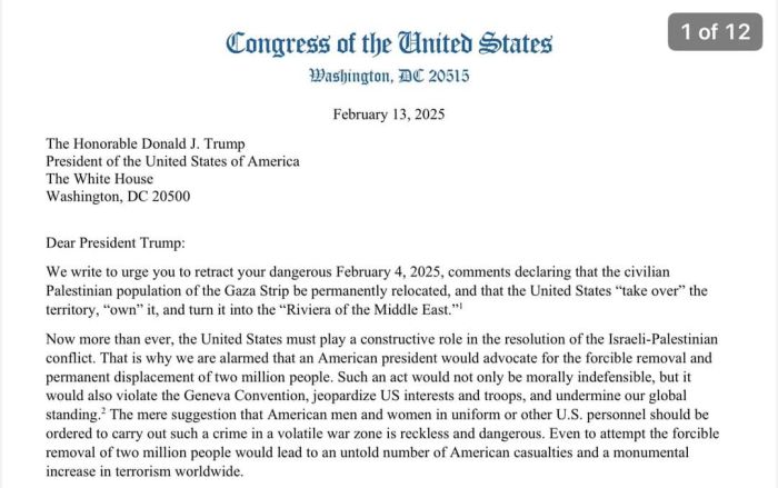 وقع 143 من أصل 215 عضوًا ديمقراطيًا في مجلس النواب الأمريكي على رسالة وجهوها إلى الرئيس دونالد ترامب، طالبين منه التراجع عن تعليقاته المثيرة للجدل بشأن قطاع غزة. ويأتي هذا التحرك بعد تصريحات لترامب دعا فيها إلى الإبعاد القسري لمليوني شخص من غزة.