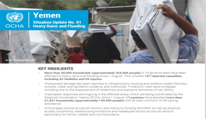More than 50,600 households (approximately 354,400 people) in 19 governorates have been affected by heavy rains and flooding since 1 August, according to the latest update of heavy rains and flooding published by UN Office for the Coordination of Humanitarian Affairs in Yemen (OCHA). This includes 157 reported casualties, including 62 fatalities and 95 injuries.
