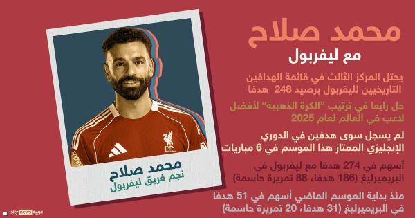 يشار إلى أن محمد صلاح لم يسجل خلال 6 مباريات خاضها منذ بداية الموسم الحالي في بطولة البريميرليغ سوى هدفين، أحدهما ضد بورنموث في الدقائق الأخيرة للمباراة، والآخر ضد بيرنلي، وكان ركلة جزاء.