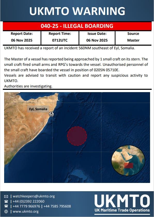 قال مكتب عمليات التجارة البحرية في المملكة المتحدة إنه تلقى بلاغًا عن حادث على بعد 560 ميلًا بحريًا جنوب شرق إيل، الصومال.