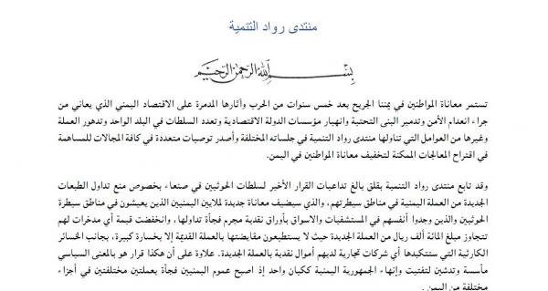 طالب منتدى رواد التنمية اليمنية سلطة المليشيات الحوثية بإلغاء قرارها المجحف فوراً ودون قيد أو شرط والقاضي بمنع حيازة وتداول الطبعة الجديدة من العملة الوطنية في مناطق سيطرتها والكف عن التدخل في الشؤون البنكية والمصرفية .