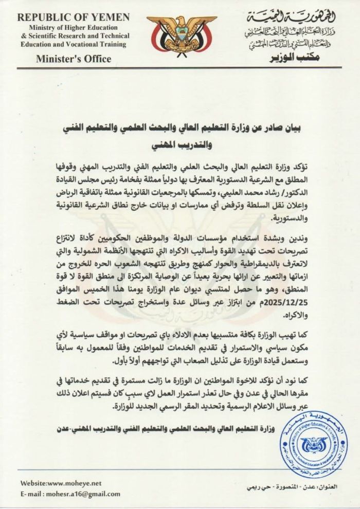 وشددت الوزارة في بيانها على تمسكها الكامل بالمرجعيات القانونية، وفي مقدمتها اتفاقية الرياض وإعلان نقل السلطة، معلنةً رفضها القاطع لأي ممارسات أو بيانات تصدر خارج نطاق الشرعية القانونية والدستورية.