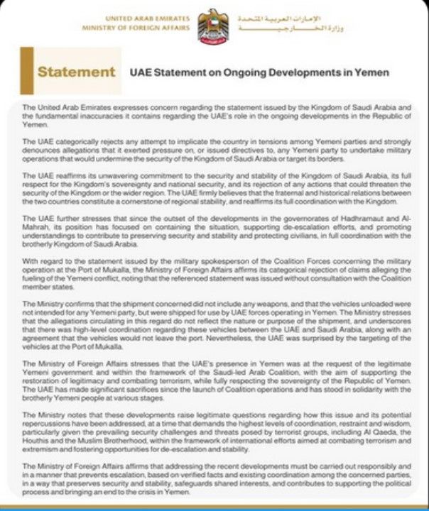 The UAE further stresses that since the outset of the developments in the governorates of Hadhramaut and Al-Mahrah, its position has focused on containing the situation, supporting de-escalation efforts, and promoting understandings to contribute to preserving security and stability and protecting civilians, in full coordination with the brotherly Kingdom of Saudi Arabia.