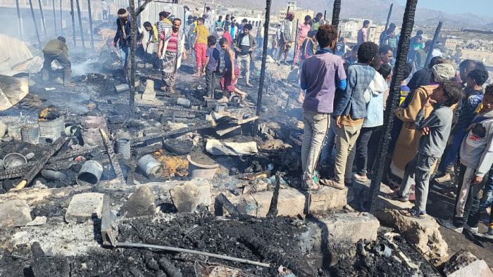 حريق هائل يلتهم مخيمًا للاجئين الصومال بمديرية قعطبة في الضالع