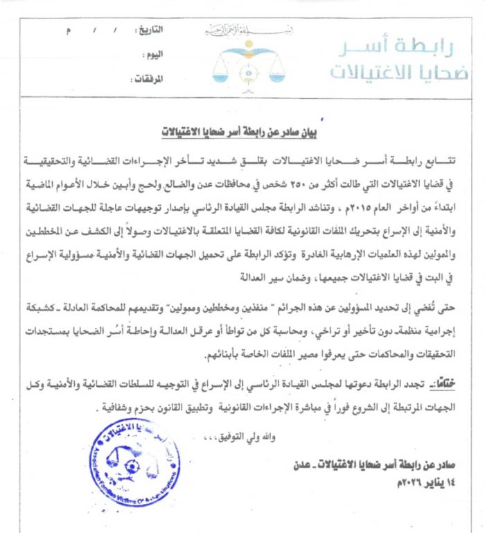 أعربت رابطة أسر ضحايا الاغتيالات عن قلقها الشديد إزاء استمرار تأخر الإجراءات القضائية والتحقيقية في قضايا الاغتيالات التي طالت أكثر من 250 شخصاً في محافظات عدن والضالع ولحج وأبين، منذ أواخر عام 2015، معتبرة أن هذا التأخير يعيق تحقيق العدالة ويضاعف معاناة أسر الضحايا. ودعت الرابطة، في بيان صادر عنها الأربعاء 14 يناير 2026، مجلس القيادة الرئاسي إلى إصدار توجيهات عاجلة للجهات القضائية والأمنية للإسراع في تحريك كافة الملفات القانونية المتعلقة بقضايا الاغتيالات، والعمل الجاد على كشف المخططين والممولين والمنفذين لتلك العمليات التي وصفتها بالإرهابية والغادرة. وأكد البيان تحميل الجهات القضائية والأمنية المسؤولية الكاملة عن سرعة البت في جميع قضايا الاغتيالات وضمان سير العدالة دون تأخير أو تراخٍ، بما يفضي إلى تحديد المسؤولين عن هذه الجرائم وتقديمهم للمحاكمة العادلة بوصفهم شبكة إجرامية منظمة، إضافة إلى محاسبة كل من تواطأ أو عرقل مسار العدالة. وشددت الرابطة على أهمية إحاطة أسر الضحايا بمستجدات التحقيقات والمحاكمات، وتمكينهم من معرفة مصير القضايا الخاصة بذويهم، مؤكدة أن الشفافية في هذا الجانب حق قانوني وإنساني لا يمكن تجاوزه. وجددت رابطة أسر ضحايا الاغتيالات دعوتها لمجلس القيادة الرئاسي والسلطات القضائية والأمنية وكافة الجهات ذات الصلة إلى الشروع الفوري في مباشرة الإجراءات القانونية، وتطبيق القانون بحزم وشفافية، بما يضمن إنصاف الضحايا وترسيخ هيبة الدولة وسيادة القانون. |