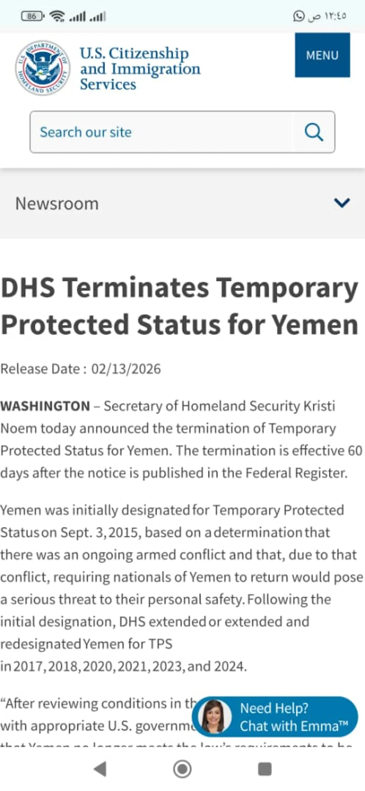 أعلنت وزيرة الأمن الداخلي الأمريكية، كريستي مايكلز نيام، عن قرار إلغاء "الوضع المحمي المؤقت" (TPS) الممنوح للمواطنين اليمنيين على الأراضي الأمريكية، على أن يصبح هذا الإلغاء ساري المفعول بعد انقضاء 60 يوماً من تاريخ نشر الإشعار في السجل الفيدرالي. ويُذكر أن اليمن كان قد مُنح هذا التصنيف لأول مرة في 3 سبتمبر 2015، بناءً على تقييم يشير إلى وجود صراع مسلح مستمر، وأن إلزام المواطنين اليمنيين بالعودة في ذلك الوقت كان سيمثل خطراً جسيماً على سلامتهم الشخصية. وقد تكررت عمليات تمديد وإعادة تصنيف الوضع لليمن في أعوام 2017، 2018، 2020، 2021، 2023، و2024 قبل قرار الإلغاء الحالي. وبررت الوزيرة نيام القرار بالإشارة إلى مراجعات شاملة وتشاور مع الوكالات الحكومية المعنية، حيث خلصت إلى أن اليمن "لم يعد يستوفي متطلبات القانون" للتصنيف بالوضع المحمي المؤقت. وأضافت الوزيرة أن استمرار السماح للمستفيدين اليمنيين بالبقاء "يتعارض مع مصلحتنا الوطنية"، مؤكدة أن الإدارة تعمل على إعادة البرنامج إلى طبيعته المؤقتة الأصلية، مع إعطاء الأولوية للأمن القومي ومصالح الولايات المتحدة. وبموجب القرار، يُمنح المستفيدون اليمنيون الذين لا يملكون أساساً قانونياً آخر للإقامة في الولايات المتحدة مهلة 60 يوماً لمغادرة البلاد طواعية قبل تاريخ سريان الإلغاء. وفي هذا السياق، شجعت الوزارة الأجانب المغادرين على استخدام تطبيق "سي بي بي هوم" التابع لدوريات الجمارك وحماية الحدود للإبلاغ عن مغادرتهم، مشيرة إلى أن هذا التطبيق يوفر وسيلة آمنة للترحيل الذاتي، ويتضمن مزايا تشمل تذكرة طيران مجانية ومكافأة مغادرة بقيمة 2600 دولار، بالإضافة إلى فرص محتملة للهجرة القانونية مستقبلاً. وحذرت الوزارة من أنه بعد انقضاء المهلة المحددة، قد تبدأ إدارة الأمن الداخلي في اعتقال وترحيل أي مواطن يمني يقيم بلا وضع قانوني. كما أشارت إلى أن إجبار الأجنبي على الاعتقال والترحيل القسري قد يؤدي إلى منعه من العودة إلى الولايات المتحدة مستقبلاً. |