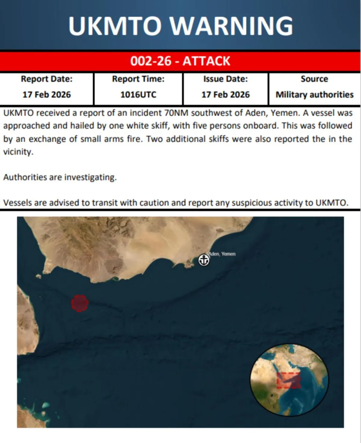 أفادت هيئة عمليات التجارة البحرية البريطانية (UKMTO) بوقوع تبادل لإطلاق نار باستخدام أسلحة خفيفة بعد اقتراب قارب صغير يحمل خمسة أشخاص من سفينة تجارية قبالة السواحل اليمنية. وأوضحت الهيئة في بيان صدر عنها أن الحادثة وقعت عندما اقترب القارب المشبوه من السفينة وأصدر إشارات غير واضحة، مما استدعى رداً أمنياً من طاقم السفينة المعنية. وذكر البيان أن الاشتباك تضمن تبادلاً لإطلاق النار بالأسلحة الخفيفة بين القارب والسفينة، مشيراً إلى أن التفاصيل الدقيقة حول سبب هذا الاقتراب والتبادل الناري لا تزال قيد المتابعة والتحقيق. وأكدت الهيئة أن السفينة وطاقمها استأنفا رحلتهما بعد وقوع الحادث، دون ورود تقارير فورية عن وقوع إصابات أو أضرار مادية جسيمة للسفينة التجارية. |