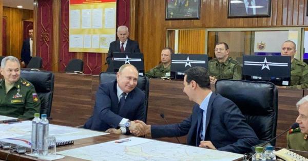 ونشر حساب الرئاسة السورية على مواقع التواصل الاجتماعي صورة للأسد وهو يصافح بوتن، بينما يجلس بالقرب منهما ضباط روس.