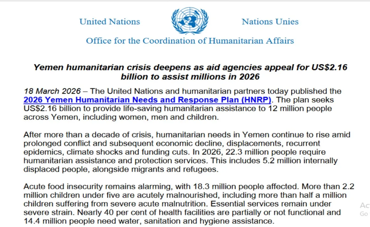 The United Nations and humanitarian partners today (Wednesday) published the 2026 Yemen Humanitarian Needs and Response Plan (HNRP). A press release by UN Office for the Coordination of Humanitarian Affairs (OCHA) stated that the plan seeks US$2.16 billion to provide life-saving humanitarian assistance to 12 million people across Yemen, including women, men and children. After more than a decade of crisis, humanitarian needs in Yemen continue to rise amid prolonged conflict and subsequent economic decline, displacements, recurrent epidemics, climate shocks and funding cuts. In 2026, 22.3 million people require humanitarian assistance and protection services. This includes 5.2 million internally displaced people, alongside migrants and refugees. Acute food insecurity remains alarming, with 18.3 million people affected. More than 2.2 million children under five are acutely malnourished, including more than half a million children suffering from severe acute malnutrition. Essential services remain under severe strain. Nearly 40 per cent of health facilities are partially or not functional and 14.4 million people need water, sanitation and hygiene assistance. Through the 2026 HNRP, humanitarian partners aim to reach 12 million people, prioritizing 9.4 million in the highest severity areas, as resources remain limited. “With needs increasing, challenging operational conditions, including on safety and security of humanitarian workers, and resources shrinking, our response is focused on delivering principled, inclusive and accountable life-saving assistance, to those most in need.” said the Humanitarian coordinator a.i. in Yemen, Zeina Ali. |
