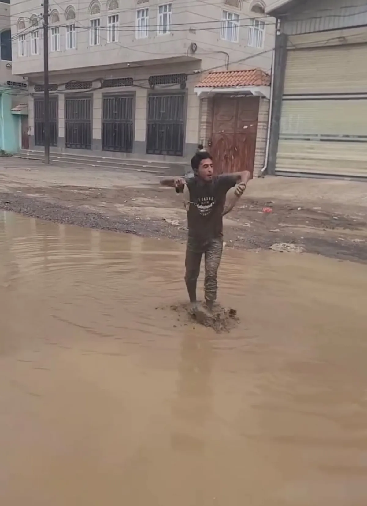 مواطن في يريم يحتج بالسباحة وسط مياه الصرف الصحي للمطالبة بالتدخل