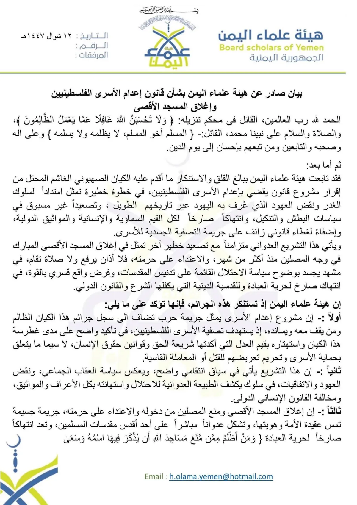 أدانت هيئة علماء اليمن بشدة ما أقدم عليه الكيان الصهيوني من إقرار مشروع قانون يقضي بإعدام الأسرى الفلسطينيين، وتزامنت هذه الخطوة مع تصعيد خطير تمثل في إغلاق المسجد الأقصى المبارك أمام المصلين لأكثر من شهر. أصدرت هيئة علماء اليمن بياناً عبرت فيه عن قلقها البالغ واستنكارها الشديدين لإقرار الكيان الصهيوني لمشروع قانون إعدام الأسرى الفلسطينيين، واصفةً إياه بأنه سلوك غدر ونقض للعهود وتصعيد غير مسبوق في سياسات البطش، ويمثل انتهاكاً صارخاً للقيم السماوية والإنسانية والمواثيق الدولية، ويسعى لإضفاء غطاء قانوني زائف على جريمة التصفية الجسدية للأسرى. وأشارت الهيئة إلى أن هذا التشريع العدواني يتزامن مع إغلاق المسجد الأقصى المبارك في وجه المصلين، والاعتداء على حرمته، مما يجسد سياسة الاحتلال في تدنيس المقدسات وفرض واقع قسري بالقوة، وانتهاك صارخ لحرية العبادة وقدسية المكان الدينية. وفي سياق متصل، أكدت هيئة علماء اليمن أن مشروع إعدام الأسرى يمثل جريمة حرب تضاف إلى سجل جرائم الاحتلال، ويعكس سياسة الانتقام والعقاب الجماعي ونقض العهود، مخالفاً بذلك القانون الإنساني الدولي. كما وصفت الهيئة إغلاق المسجد الأقصى ومنع المصلين من دخوله بأنه جريمة جسيمة تمس عقيدة الأمة وهويتها وعدوان مباشر على أحد أقدس مقدسات المسلمين. وشددت الهيئة على أن مقاومة الاحتلال حق مشروع كفلته الشرائع السماوية والقوانين الدولية، ودعت الدول الإسلامية حكومات وشعوباً إلى التحرك العاجل لوقف القانون الجائر ونصرة الأسرى الفلسطينيين. كما حملت العلماء والدعاة مسؤوليتهم الشرعية في بيان خطورة هذه الجرائم وتوعية الأمة بحقيقة ما يجري، داعيةً الخطباء والأئمة إلى تخصيص خطب الجمعة للحديث عن معاناة الأسرى والانتهاكات بحق المسجد الأقصى، والدعاء لهم ودعم صمود الشعب الفلسطيني. كما دعت الهيئة إلى تفعيل الجهود القانونية والإعلامية لفضح جرائم الاحتلال وملاحقته أمام الهيئات الدولية. واختتمت الهيئة بيانها بالدعاء للنصر للمظلومين وفك أسر الأسرى وحفظ المسجد الأقصى. |