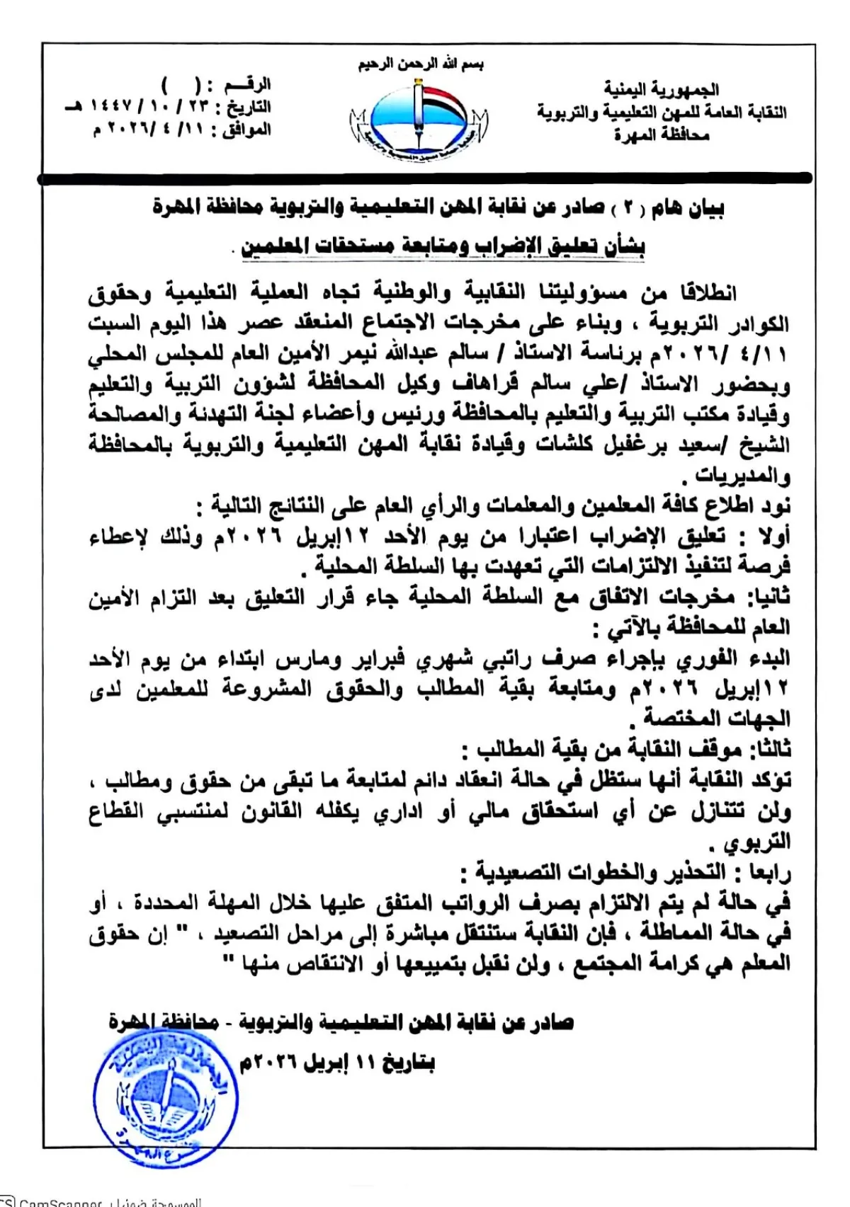 نقابة المهن التعليمية بالمهرة تُعلن تعليق الإضراب واستئناف الدراسة