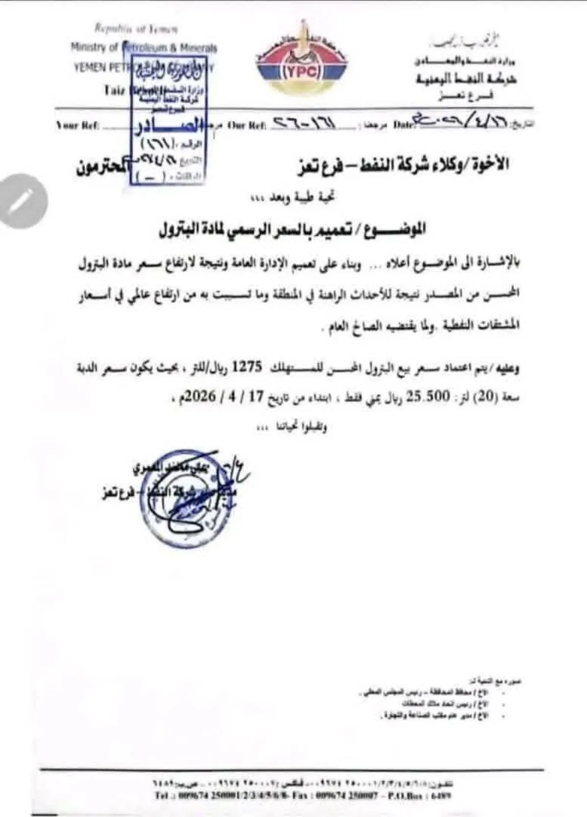 أعلنت شركة النفط اليمنية، فرع تعز، عن تسعيرة رسمية جديدة لمادة البترول (المحسن)، وذلك بهدف تخفيف الأعباء المعيشية عن المواطنين في المحافظة، وتأتي هذه الخطوة استجابة للمتغيرات الاقتصادية الأخيرة. وفقاً للتعميم الرسمي الصادر عن إدارة فرع تعز، فقد تقرر اعتماد سعر اللتر الواحد من البترول المحسن بـ 1,275 ريال يمني، فيما بلغ سعر "الدبة" ذات سعة 20 لترًا 25,500 ريال يمني، على أن يبدأ تطبيق هذه الأسعار اعتبارًا من يوم الجمعة الموافق 17 أبريل 2026م. يُسجل هذا الإقرار في تعز فارقًا سعريًا ملحوظًا مقارنة بأسعار الوقود في العاصمة المؤقتة عدن، حيث يصل هذا الفارق إلى 4,000 ريال يمني لصالح المواطن في تعز عن كل "دبة" سعة 20 لترًا، مما يخفف من حدة الأزمة المعيشية. وأوضحت الشركة أن هذا التعديل السعري جاء بناءً على تعميم من الإدارة العامة، ويعكس ارتفاع أسعار مادة البترول من المصدر بسبب الأحداث الراهنة في المنطقة وما نتج عنها من اضطرابات في الأسعار العالمية للمشتقات النفطية، مؤكدة أن تحديد هذا السعر يأتي في إطار المصلحة العامة. في سياق متصل، وجهت الشركة وكلاءها في المحافظة بالالتزام التام بالتسعيرة الجديدة، محذرة من أي مخالفات قد تزيد من معاناة المواطنين في ظل الظروف الراهنة. |