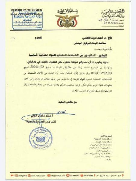 وطالبت وزارة التجارة في الوثيقة محافظ البنك المركزي بتوجيه المختصين لإفادة الوزارة بالملفات والمعلومات عن المستفيدين .