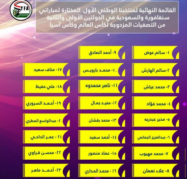 واعلن الجهاز الفني عن القائمة المختارة والمغادرة إلى سنغافورة ومن ثم البحرين لملاقاة الاخضر السعودي في العاشر من ديسمبر