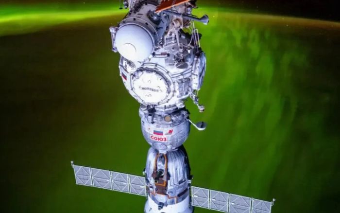 رائد فضاء يلتقط صورا للشفق الأخضر خلف مركبة فضاء روسية