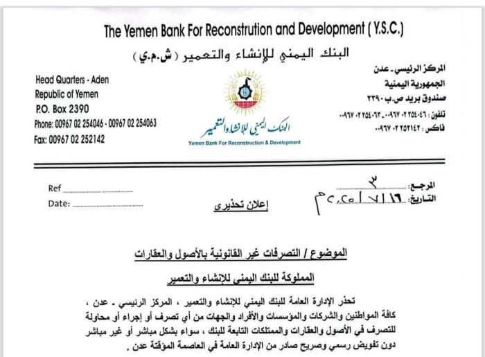 البنك اليمني للإنشاء والتعمير يحذّر من محاولات احتيالية لبيع أصوله في صنعاء