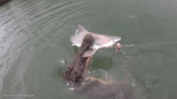 تمكن صيادان في أستراليا، أواخر فبراير الماضي، من تسجيل لحظة إقدام تمساح على عض وسحب قرش كان عالقا في صنارة الصيد وسط المياه.