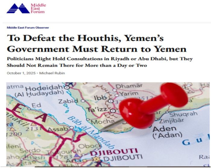 Rubin, a senior fellow at the American Enterprise Institute, where he specializes in Middle Eastern countries, in an opinion published by The Middle East Forum, added “Just as Southern Transitional Council members live and govern Aden and its environs, the northern politicians should relocate to Mocha, a northern Yemeni city along the Bab-el-Mandab”.
