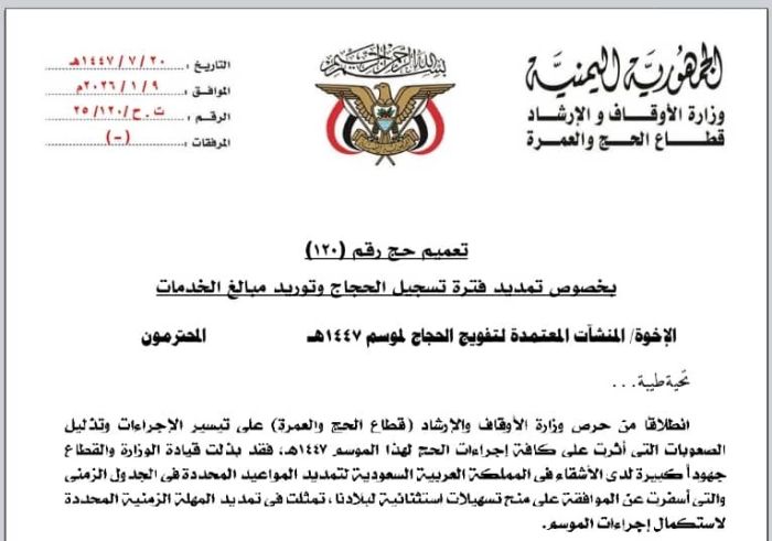 وبحسب تعميم صادر عن الوزارة، جاء قرار التمديد عقب موافقة الأشقاء في المملكة العربية السعودية على منح تسهيلات استثنائية لليمن، تمثلت في تمديد المهلة الزمنية المحددة لاستكمال إجراءات الموسم، مع التأكيد على وكالات التفويج الالتزام بالمواعيد النهائية المحددة كونها غير قابلة لأي تمديد إضافي.